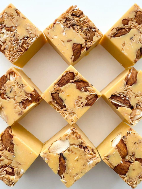 Bombom maciço de chocolate branco caramelizado com amêndoas e coco queimado.